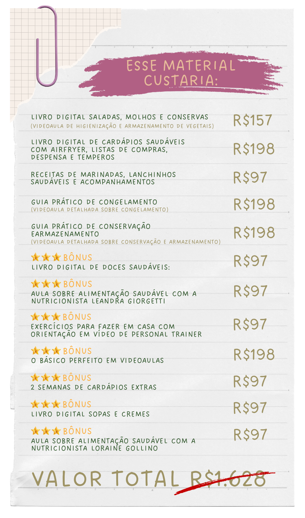 2 Semanas extras de Cardápios saudáveis e variados, com lista de compras, feitos para facilitar sua rotina e trazer mais sabor ao seu dia a dia. Isso significa refeições fresquinhas direto da Air Fryer.
